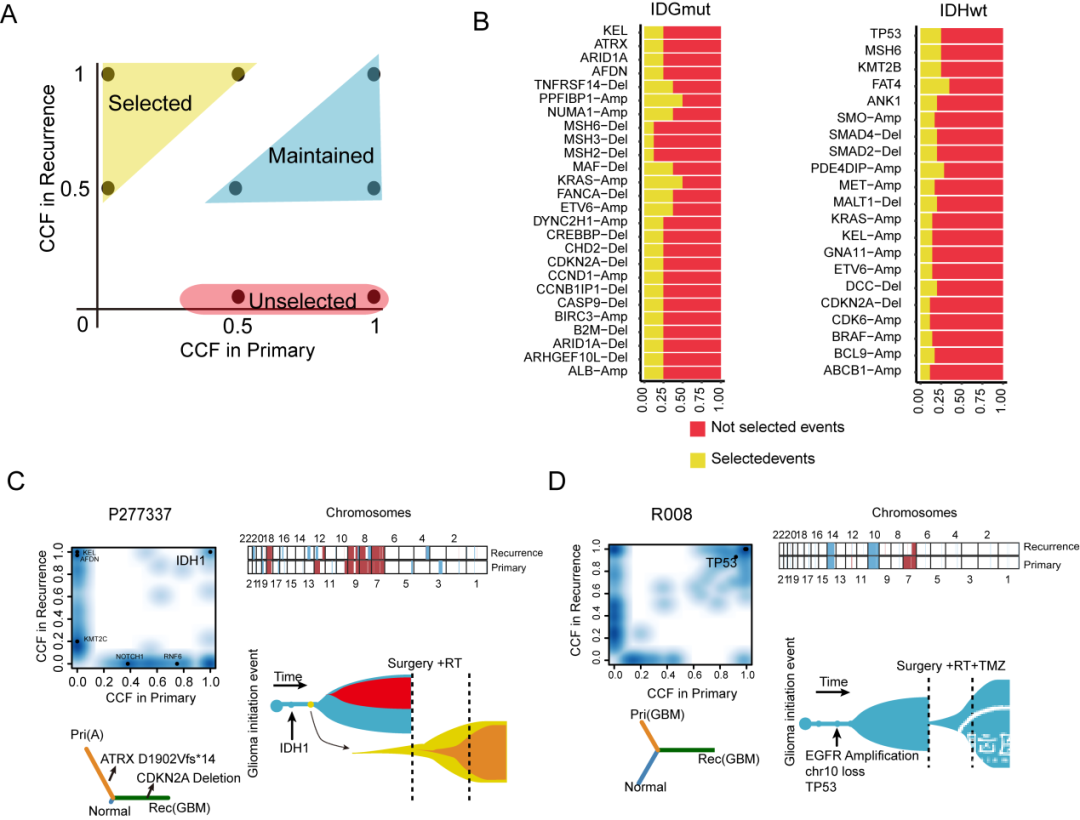 原/复发配对胶质瘤样本结果显示复发符合分支进化的模式;所以,基于原发肿瘤基因特征的治疗方案,可能不适合用于复发胶质瘤的治疗。
