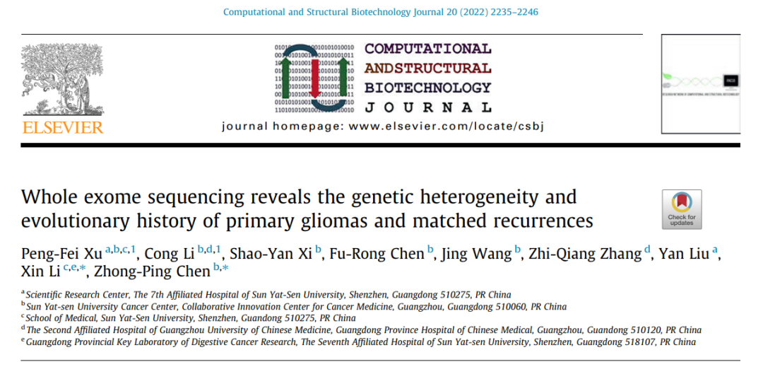 近日,中山大学肿瘤防治中心的陈忠平教授团队,对复发胶质瘤患者的原发/复发肿瘤组织样本进行全外显子测序,并结合临床数据进行比对分析研究。结果发表在Computational and Structural Biotechnology Journal(CSBJ,计算与结构生物技术杂志,2021年影响因子/JCR分区:7.271/Q1)上。中山大学肿瘤防治中心许鹏飞博士和李聪博士为共同第一作者,中山大学肿瘤防治中心陈忠平教授和中山大学医学院李昕教授为共同通讯作者。