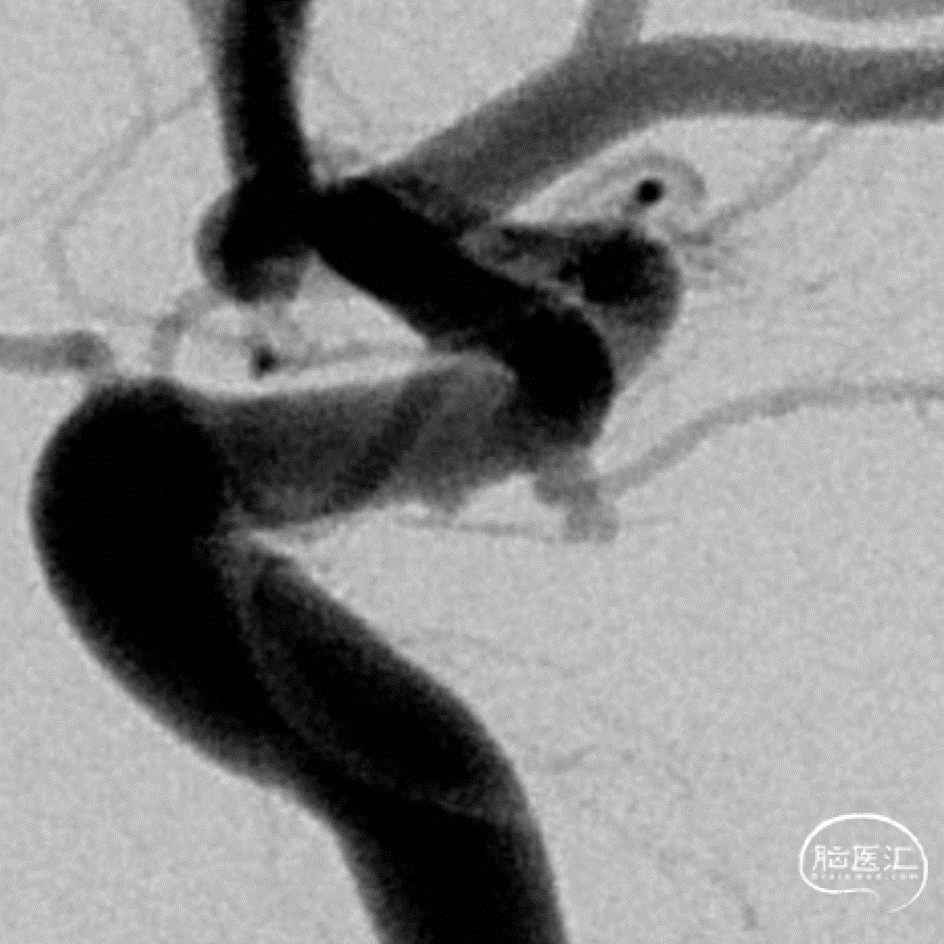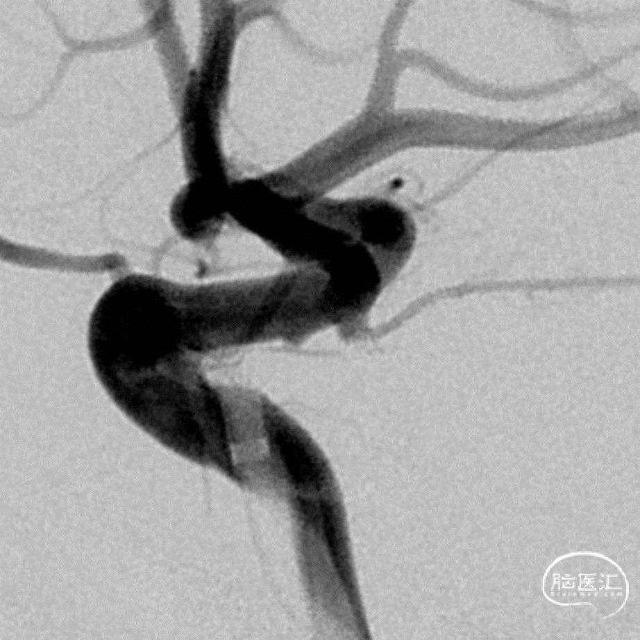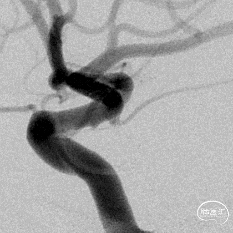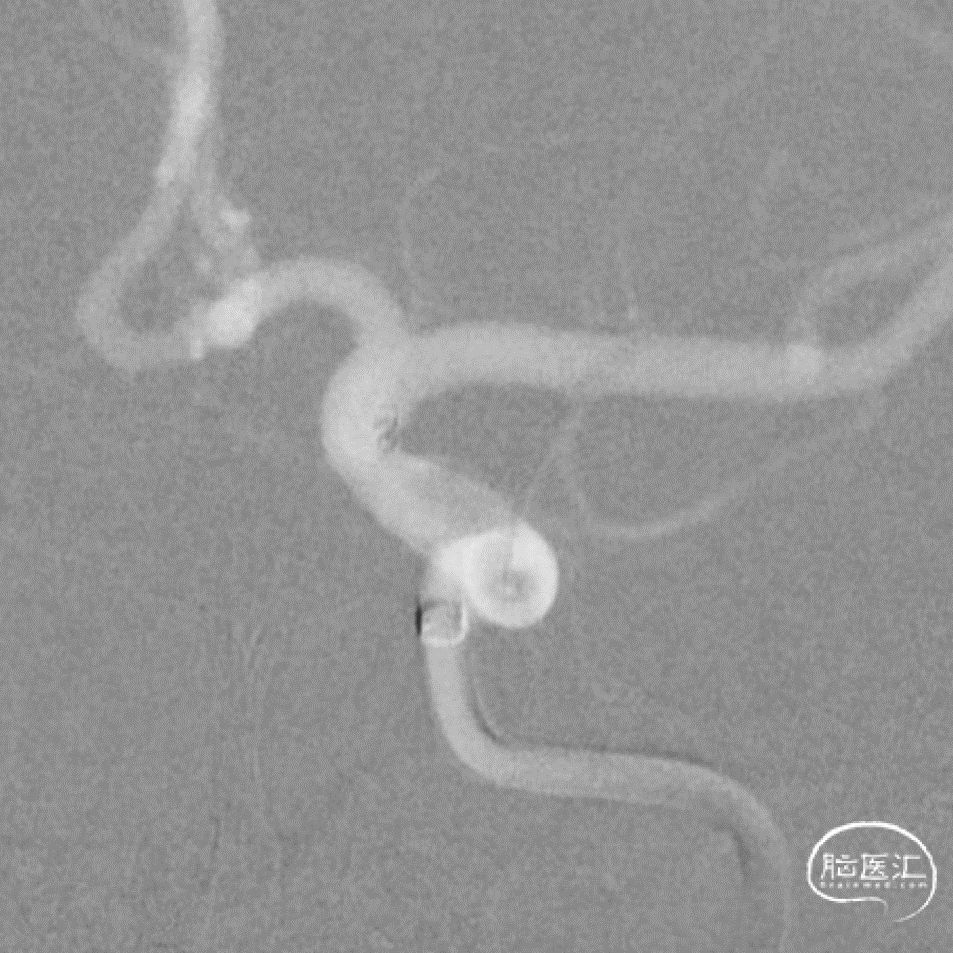 该动脉瘤为真性脉络膜前动脉动脉瘤,解剖结构和治疗具有复杂性:首先,其位置距离脉络膜前动脉和颈内动脉的交接处有一段距离,治疗相对困难;其次,该动脉瘤又是相对宽颈的微小动脉瘤,弹簧圈的成篮、稳定性和大小选择要求更高;最后,该动脉瘤为破裂动脉瘤,急性期单纯栓塞动脉瘤,有利于降低/消除再次出血的风险,避免了急性期支架植入使用抗血小板药物的顾虑。
