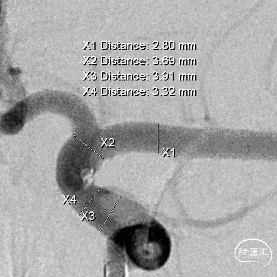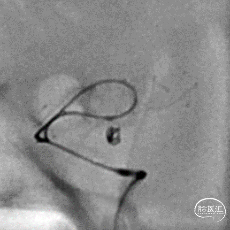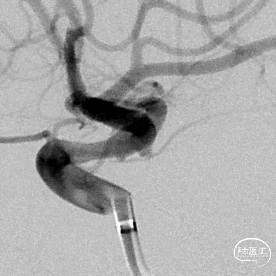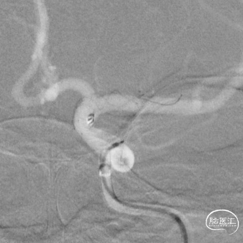 该动脉瘤为真性脉络膜前动脉动脉瘤,解剖结构和治疗具有复杂性:首先,其位置距离脉络膜前动脉和颈内动脉的交接处有一段距离,治疗相对困难;其次,该动脉瘤又是相对宽颈的微小动脉瘤,弹簧圈的成篮、稳定性和大小选择要求更高;最后,该动脉瘤为破裂动脉瘤,急性期单纯栓塞动脉瘤,有利于降低/消除再次出血的风险,避免了急性期支架植入使用抗血小板药物的顾虑。