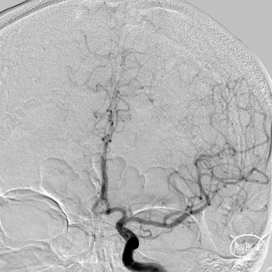 患者男性,31岁,因突发头痛3小时入院。诊断:自发性蛛网膜下腔出血;破裂的真性脉络膜前动脉微小动脉瘤。急诊给与动脉瘤单纯栓塞术。一个月后,二期给与支架植入术。