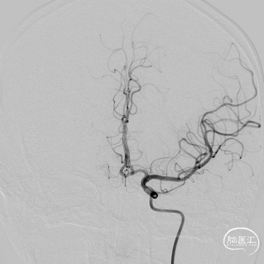 目前,很少的研究关注真性脉络膜前动脉(AchA)动脉瘤的治疗[8]。动脉瘤位于AchA和ICA交接处的远端。当AchA的起始部又扩大为壶腹的时候,支架植入直径梯度大的AChA是有挑战性的。对于小直径和破裂的动脉瘤来说,AchA或者ICA内植入支架也存在缺血性事件的风险。同样的,ICA内的球囊或者支架辅助栓塞也难以对真性脉络膜前动脉动脉瘤提供有效的脚手架的支撑保护,存在弹簧圈疝出到AChA的风险。在本例患者中,我们采用急性期单纯栓塞的策略致密栓塞真性脉络膜前动脉微小动脉瘤,二期(一个月后)给与支架植入预防复发。通过分期治疗的策略成功治疗该例患者,患者围手术期和6个月临床随访的mRS评分为0分。血管造影的随访近期计划安排中。