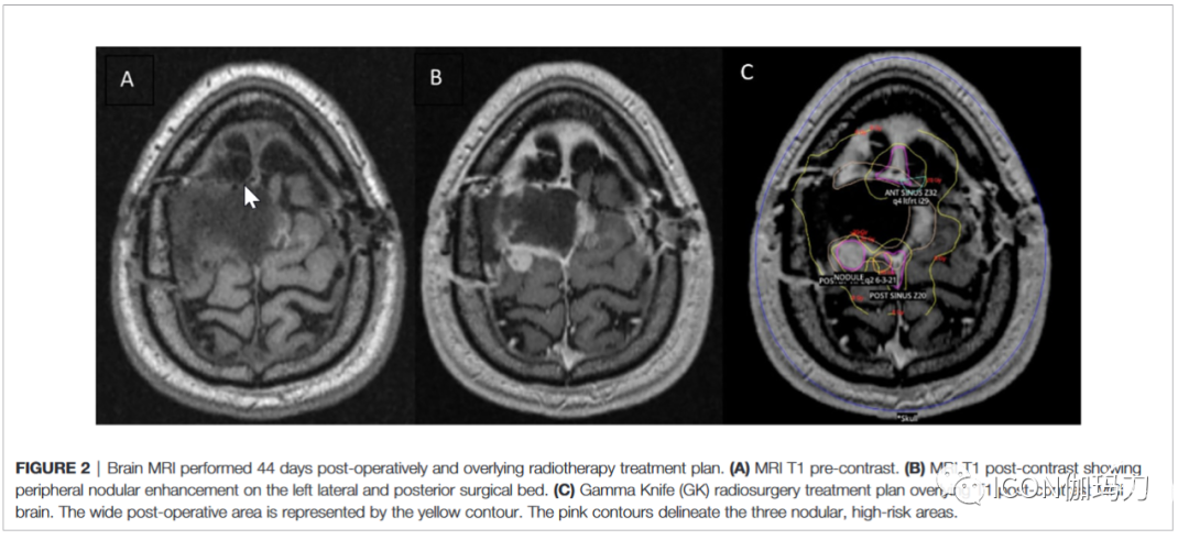 图2术后44天颅脑MRI及覆盖放疗治疗方案。(A) MRI T1平扫。(B) MRI T1增强扫描显示左侧手术瘤床及后方周围结节强华。(C)脑T1增强后MRI叠加伽玛刀(GK)放射外科治疗方案。黄色轮廓表示手术后的大面积区域。粉红色的轮廓勾画出三个结节状高危区域。