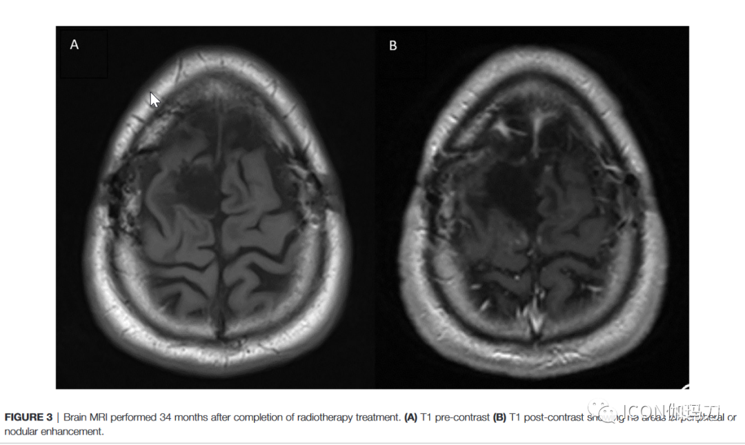完成巩固性SBRT 3个月后的MRI显示硬膜下积液和硬膜强化结节覆盖右额叶后部,尺寸为0.3 x 0.7 cm。同时的神经外科随访没有发现临床变化。此后大约每3个月的MRI和临床随访显示无新证据显示疾病复发,且强化逐渐消退。放射外科治疗结束后34个月进行的最新的脑MRI显示,只有预期的胶质细胞增生,术后改变,没有强化的病灶或肿瘤复发的证据(图3)。患者在完成治疗后仍无症状,无任何功能障碍。
