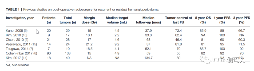 在过去的十年中,立体定向放射外科(SRS),特别是GK,已经成为一种很有前途的对术后SFT的治疗方式。多个病例研究表明,与单纯切除术相比,辅助放疗后SRS治疗更有利于生存,在文献中,手术和辅助放疗后SRS治疗的SFT的3年无进展生存期(PFS)在60-92%之间(表1)。然而,即使有这种PFS优势,辅助放疗后的局部复发仍然普遍。因此,仍需要更有效的术后治疗方法。一些研究,如Kano等的20例患者系列和Cohen-Inbar等的多中心研究发现,辅助GK的累积辐射剂量较高,与治疗SFT中PFS的改善相关。