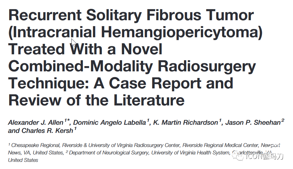 《Frontiers in Oncology》 2022年5月26日在线发表美国Riverside & University of Virginia Radiosurgery Center, Riverside Regional Medical Center的 Alexander J. Allen, Dominic Angelo Labella, K. Martin Richardson,等撰写的《新型的联合放射外科技术治疗复发性孤立性纤维瘤(颅内血管外皮细胞瘤):病例报告及文献综述。Recurrent Solitary Fibrous Tumor (Intracranial Hemangiopericytoma) Treated With a Novel Combined-Modality Radiosurgery Technique: A Case Report and Review of the Literature》(doi: 10.3389/fonc.2022.907324)。