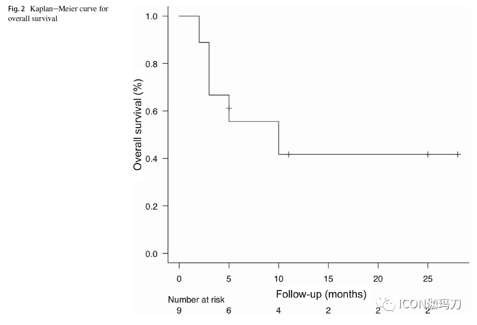 处方剂量为30-40 Gy,最大剂量为42.9-54.1 Gy。每个疗程治疗1-13个病灶(囊肿及其他一般性转移瘤)。只有1例患者的病变超过30个,其中7个(可能导致神经系统症状)被选择并纳入治疗。所有患者在GKRS治疗期间接受了至少一次Ommaya贮液囊穿刺。术后随访至少2个月。GKRS治疗后,对病例3、4、5、6、8行辅助化疗;病例3、5、8接受免疫治疗。MRI平均随访时间9.2(2-28)个月,临床平均随访时间10.2(2-28)个月。未观察到与辐照相关的不良事件。9个病灶的肿瘤体积均得到控制。中位总体生存期(OS)为10.0个月,估计1年生存率为41.7% (95% CI: 10.9-70.8%;图2),肿瘤控制率100%。