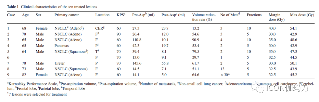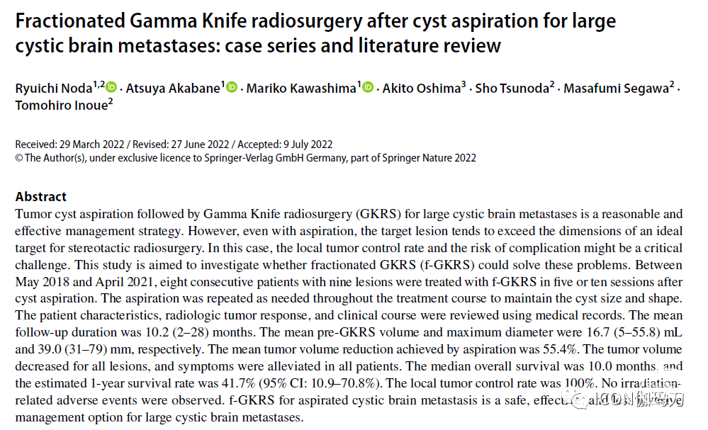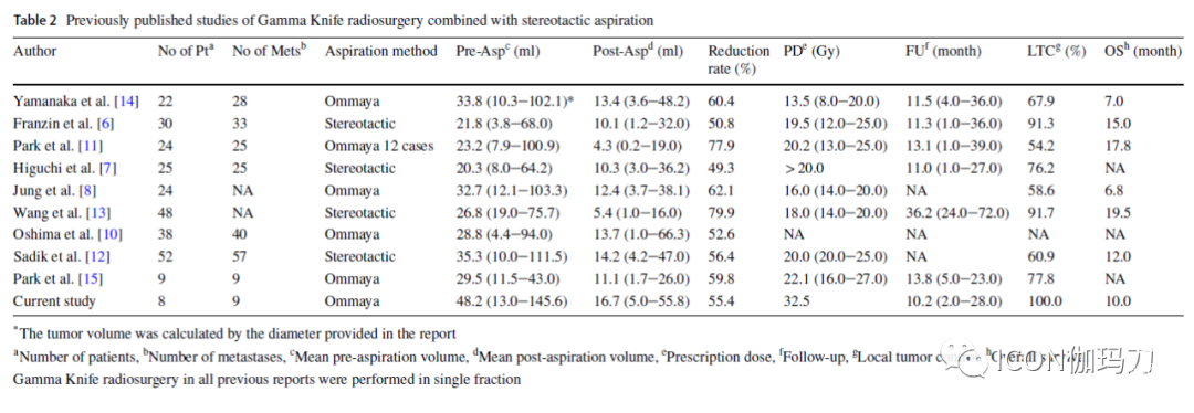 既往报道的囊性肿瘤的平均体积为20.3-35.3 mL;在我们的研究中,由于两个巨大的囊肿(145和110 mL),平均体积是48.2 mL。所有患者均有囊性病变,体积>10ml,直径3cm;因此,其对放疗有抵抗性,放疗坏死风险高。在我们的患者中,考虑到手术相关播散的风险,我们选择了囊肿抽吸加GKRS治疗,而不是肿瘤切除术,据报道,开颅肿瘤切除术的播散风险较高。在f-GKRS前必须将囊肿抽吸,以减少靶病灶的体积。这种治疗方法以前曾被报道(表2)作为一种有效的治疗策略。然而,这种方法的缺点是即使成功抽除囊肿,囊肿仍有很高的复发风险。由于几个月后GKRS的治疗效果明显,治疗后可能出现囊肿的充分复发,需要再次抽吸。此外,肿瘤体积较大,且常呈不规则形状;因此,对立体定向放射外科治疗是不利的。这一行为可能是以往大多数报道中肿瘤局部控制不理想的原因。因此,也应提高脑转移灶的局部肿瘤控制率,f-GKRS可用于这些情况。ICON型伽玛刀允许对较大病变进行分割无框治疗。在以前的报道中,分割治疗与高肿瘤控制率和低并发症发生率相关。然而,过去没有关于f-GKRS用于抽吸囊性脑转移瘤的报道(表2)。我们的治疗结果比之前报道的立体定向囊性肿瘤抽吸和传统单次分割GKRS联合治疗的结果更为有利。与其他报道相比,我们的方法肿瘤控制率有所提高;因此,f-GKRS联合囊性肿瘤抽吸是安全治疗囊性脑转移瘤的一种合理有效的方法。这种策略通过分割辐射剂量和通过Ommaya贮液囊抽吸,以减少囊肿体积来降低放射性坏死的风险,这也防止了治疗期间和治疗后囊内囊腔所需的回缩。