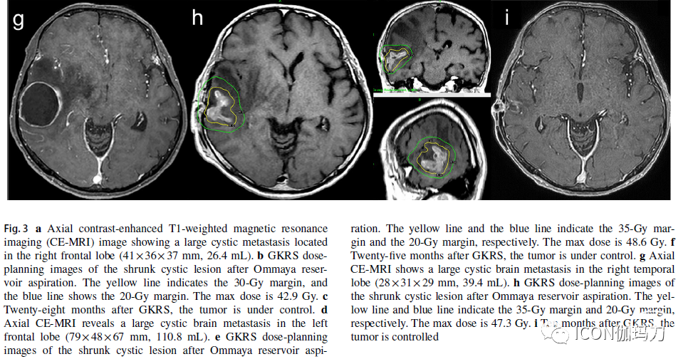 图3轴位增强T1加权磁共振成像(CE-MRI)图像显示位于右侧额叶的一个大的囊性转移(41x36x37 mm, 26.4 mL)。b Ommaya贮液囊抽吸后缩小囊性病变的GKRS剂量计划图像。黄线表示30-Gy的边缘,蓝线表示20-Gy的边缘。最大剂量为42.9 Gy。c GKRS后28个月,肿瘤得到控制。d轴位增强MRI示左侧额叶大的囊性脑转移瘤(79x48x67 mm, 110.8 mL)。e 从Ommaya贮液囊抽吸后缩小囊性病变的GKRS剂量计划图像。黄线和蓝线分别表示35-Gy和20-Gy的边界。最大剂量为48.6 Gy。f GKRS后25个月,肿瘤得到控制。g轴位增强MRI示右侧颞叶大囊性脑转移瘤(28x31x29 mm, 39.4 mL)。h 从Ommaya贮液囊抽吸后缩小囊性病变的GKRS剂量计划图像。黄线和蓝线分别表示35-Gy和20-Gy的边缘。最大剂量为47.3 Gy。i GKRS后10个月,肿瘤得到控制。