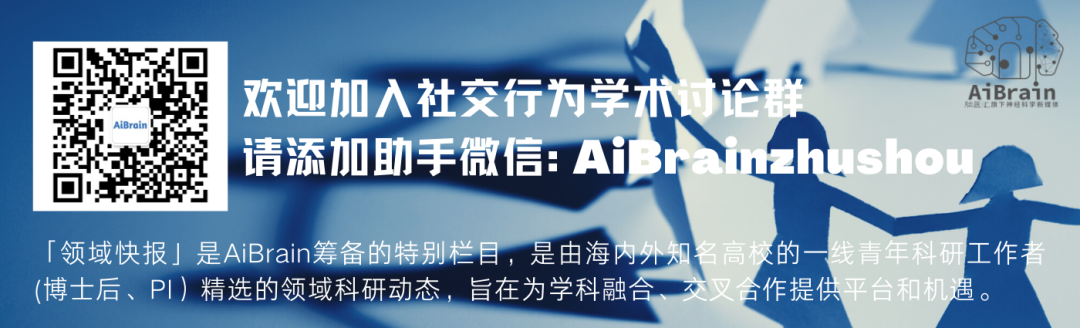 「领域快报」是AiBrain筹备的特别栏目,是由海内外知名高校的一线青年科研工作者(博士后、PI)精选的领域科研动态,旨在为学科融合、交叉合作提供平台和机遇。