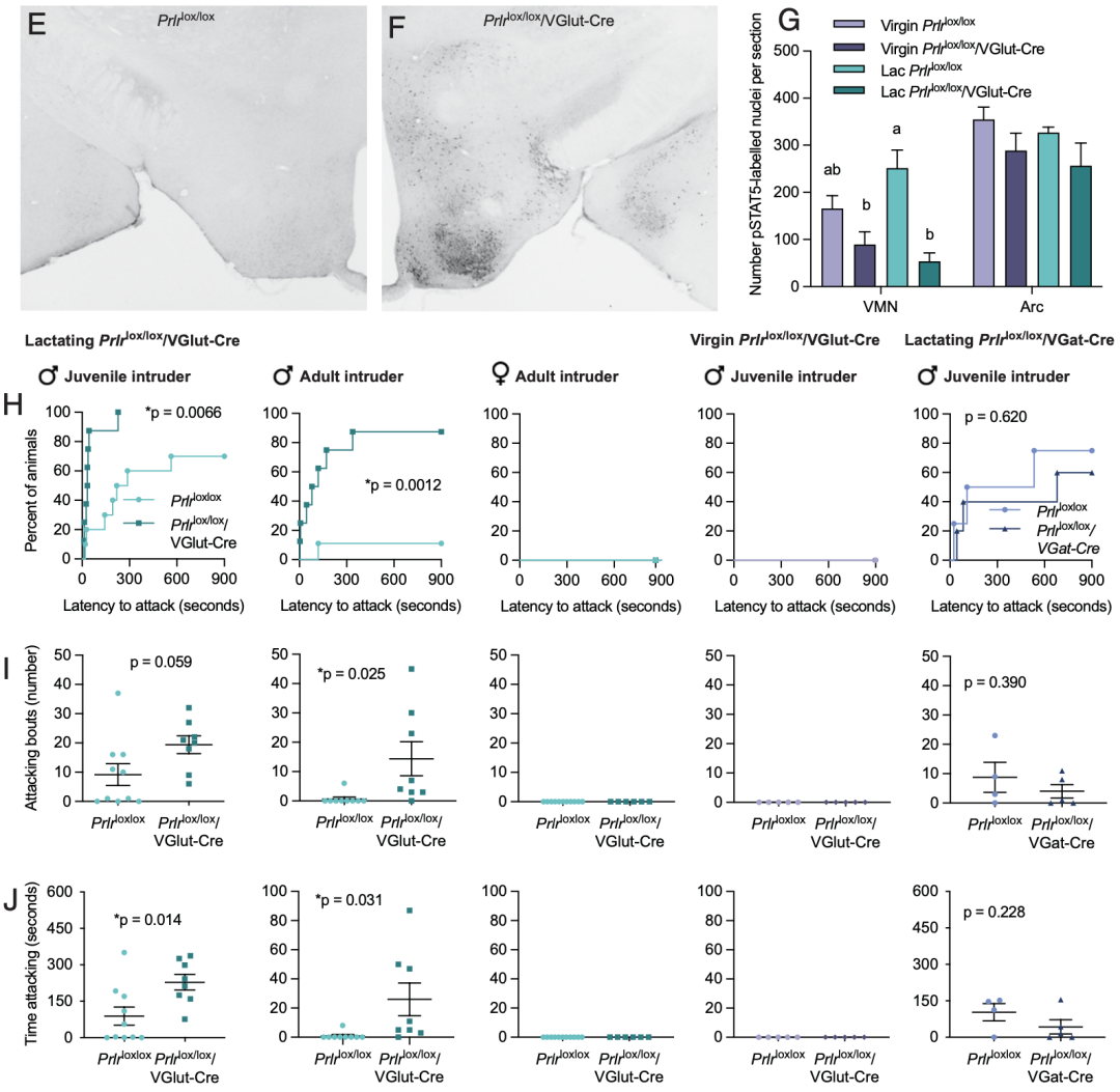哺乳期雌性的母性攻击对于保护幼仔免于危险置关重要,而产后抑郁等可能会导致雌性的过度攻击。催乳素,作为孕期和产后机体内水平升高的激素之一,可能在其中发挥重要作用。本文研究了催乳素通过作用于小鼠腹中侧下丘脑(VMN/VMH)来调节哺乳期雌性的母性攻击行为。通过全局敲除或是注射病毒在VMN特异敲除谷氨酸能神经元的催乳素受体基因(Prlr),作者发现敲除后的哺乳期雌鼠表现出更强烈的攻击行为:1)针对未成年入侵雄鼠,其攻击延迟缩短,攻击次数和时间增加;2)针对成年入侵雄鼠,与未敲除哺乳期雌鼠不会进行攻击相比,其攻击延迟短,次数多,时间长。虽然通过对即刻早期基因cFos的免疫组化染色实验发现,哺乳期雌鼠在引入未成年雄鼠后,VMN的Prlr+细胞被激活,但体外实验表明催乳素只能激活脑片组织的很小部分VMN神经元。进一步地,给非哺乳期雌性注射催乳素,或在哺乳期雌鼠中注射溴隐亭药物来抑制催乳素分泌,或者通过化学遗传学方法激活VMN的Prlr+细胞,都不能明显影响入侵者导向的攻击行为,这些结果说明催乳素可能是通过长期的转录通路来调控行为。