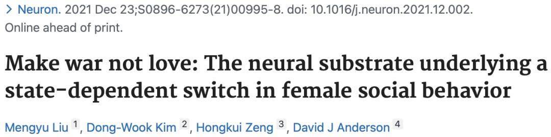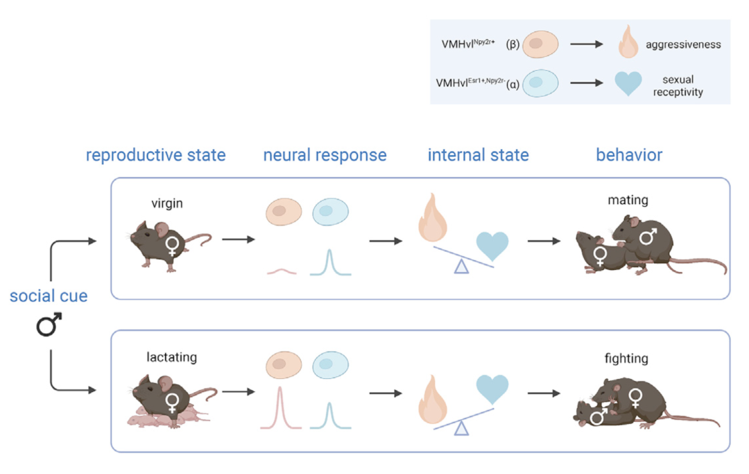 机体内在状态极大地影响行为表征,包括社交行为,而雌性动物处于不同状态,比如发情期、孕期或哺乳期时,伴随体内激素水平的变化,它们对相同刺激会表现出不同的社交行为。一个典型情况是,处于不同繁殖期的雌性在面对雄性时会做出截然相反的社交行为:发情期雌性会呈现出所谓的脊柱前凸的交配准备动作,而哺乳期雌性会发出攻击,即母性攻击。雌性的这两种社交行为切换的神经机制一直不清楚,而来自加州理工的研究成果提供了答案。他们利用活性依赖的单细胞RNA测序技术,在小鼠腹中侧下丘脑的腹外侧区(VMHvl)中发现表达雌激素受体的两个亚神经元类型分别介导了这两种行为。其中一种为神经肽Y受体(Npy2r)阴性神经元,也被称为a细胞,被激活后无论雌性处于何种繁殖状态都能诱发其交配行为,而且能即时终止哺乳期雌鼠的母性攻击。另一种叫做b细胞的Npy2r阳性神经元,被激活后即使在发情期雌性中也能诱导其攻击行为,而被抑制后能即时终止母性攻击。利用在体荧光光度计技术对同一雌性在发情期,哺乳期和断奶后3个不同状态下面对雄性社交时进行钙成像,作者进一步发现b细胞的反应在哺乳期升高,在断奶后会下降至发情期水平,而a细胞的反应大小不变。这表明,b细胞呈现出与繁殖状态相关的活动水平变化,从而介导了雌性在不同内在状态下的社交行为切换。