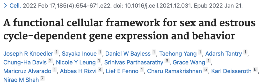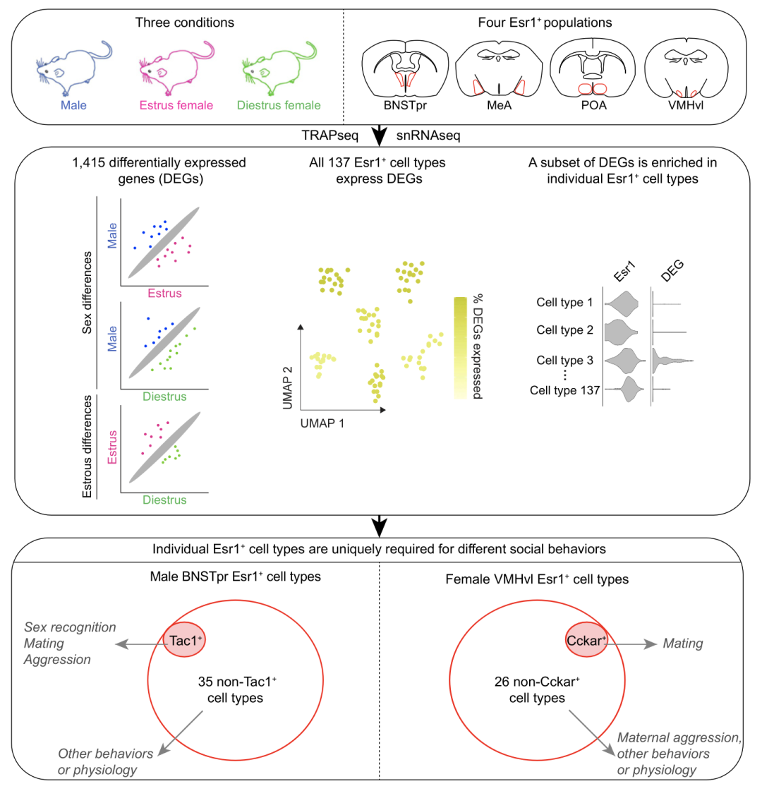性激素在不同性别和不同激素周期的个体中发挥作用相差很大。本文聚焦了发情期性接受雌鼠(FR)、发情间期性不接受雌鼠(FNR)和性腺完整的雄鼠(M)中,终纹床核(BNSTpr)、内侧杏仁核(MeA)、视前下丘脑(POA)和腹中侧下丘脑的腹外侧区(VMHvl)4个脑区的1型雌激素受体阳性(Esr1+)细胞,以探索其依赖性别和发情周期的基因表达模式及对社交行为的调制。作者首先利用翻译核糖体亲和纯化测序(TRAPseq)技术识别了1415个差异表达基因(DEGs),在此基础上通过单细胞RNA测序,定义了137个细胞类型,并结合原位杂交(ISH),显示了DEGs在4个脑区的Esr1+群体中表达分布模式的异质性。为找到调控社交行为的单个细胞类型,作者具体分析了DEGs的性别和发情周期特异性,分别发现:1)相比FR和FNR,BNSTTac1/Esr1在M鼠中上调,并通过功能缺失实验,验证了该细胞类型对雄鼠的性别识别及随后的交配或攻击的必要性;2)VMHvlCCKar/Esr1呈现性别二态性,并在FR鼠中高度富集,其投射模式也与发情周期相关,功能缺失实验证明这个细胞类型对雌鼠的交配行为置关重要,而不影响发情间期的母性攻击行为。