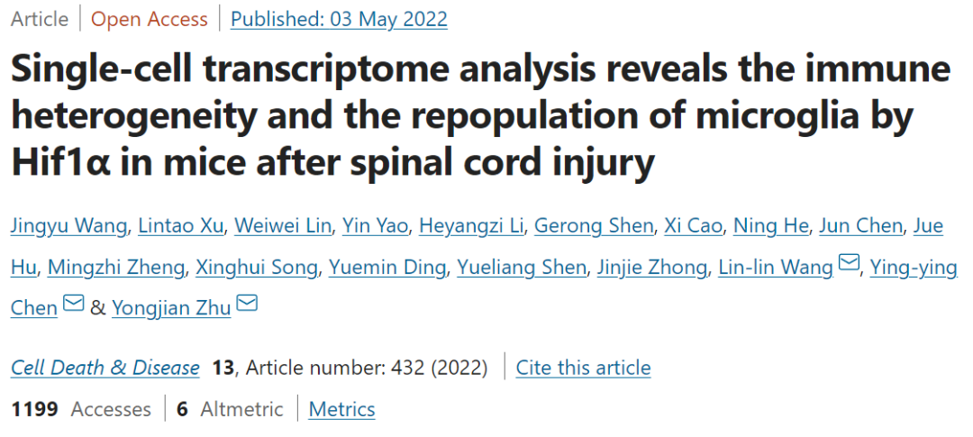 此外,朱永坚教授团队在脊髓损伤基础研究领域也获得了重要进展。团队与浙大基础医学院王琳琳课题组合作近期在《Cell Death & Disease》(2022年影响因子/JCR分区:9.685/Q1)上在线发表了题为“Single-cell transcriptome analysis reveals the immune heterogeneity and the repopulation of microglia by Hif1α in mice after spinal cord injury”的研究论文。该研究通过单细胞测序分析,揭示了小鼠SCI后脊髓内DC细胞、中性粒细胞、淋巴细胞、巨噬细胞和小胶质细胞的异质性,发现损伤后扩增的小胶质细胞源于残留的小胶质细胞,HIF1α基因促进脊髓损伤后小胶质细胞的再殖,并且有助于脊髓损伤小鼠运动功能的恢复。博士研究生汪靖宇为论文第一作者,王琳琳副教授、朱永坚教授为论文通讯作者。