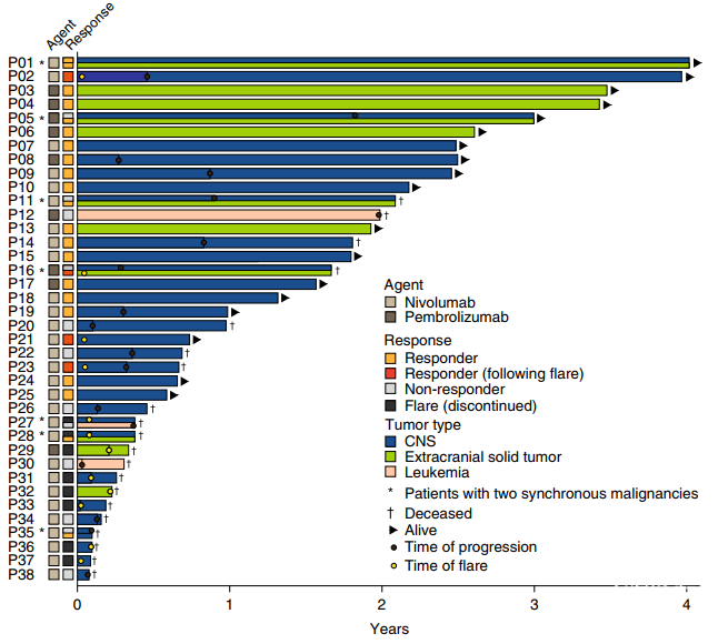 此次研究共纳入38名患者,都携带胚系复制修复缺陷(RRD),包括MMRD(28例),Lynch(8例)或 PPD(2例)综合征,肿瘤类型主要包括中枢神经系统肿瘤,非CNS实体瘤和血液系统恶性肿瘤。