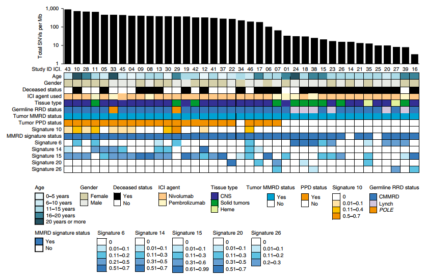 在一些突变负荷较高的成人实体类中(如黑色素瘤和肺癌),PD-1免疫检查点抑制剂(ICI)通常具有较好的响应[5, 6]。近期,《Nature Medicine》报道了一项儿童肿瘤相关研究,对38例儿童患者中45种进展或复发肿瘤的免疫检查点抑制剂(ICIs)疗效追踪,评估了由胚系DNA复制修复缺陷导致的儿童肿瘤的治疗结果和基因组预测因子[7]。