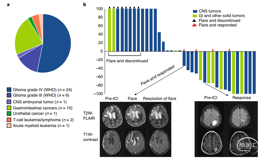 该研究预测41.4%的患者达到3年总生存期(OS),结果表明,非CNS实体瘤的存活率显著高于CNS肿瘤,复发/进展CNS肿瘤患者的OS和PFS均显著提高。所有继续ICI治疗的非CNS实体瘤患者均具有持久反应,mOS是2.6年。另外,13名CNS肿瘤患者在初始ICI治疗中出现肿瘤放射学进展,但他们的生存期是延长的,mOS为9.6个月。