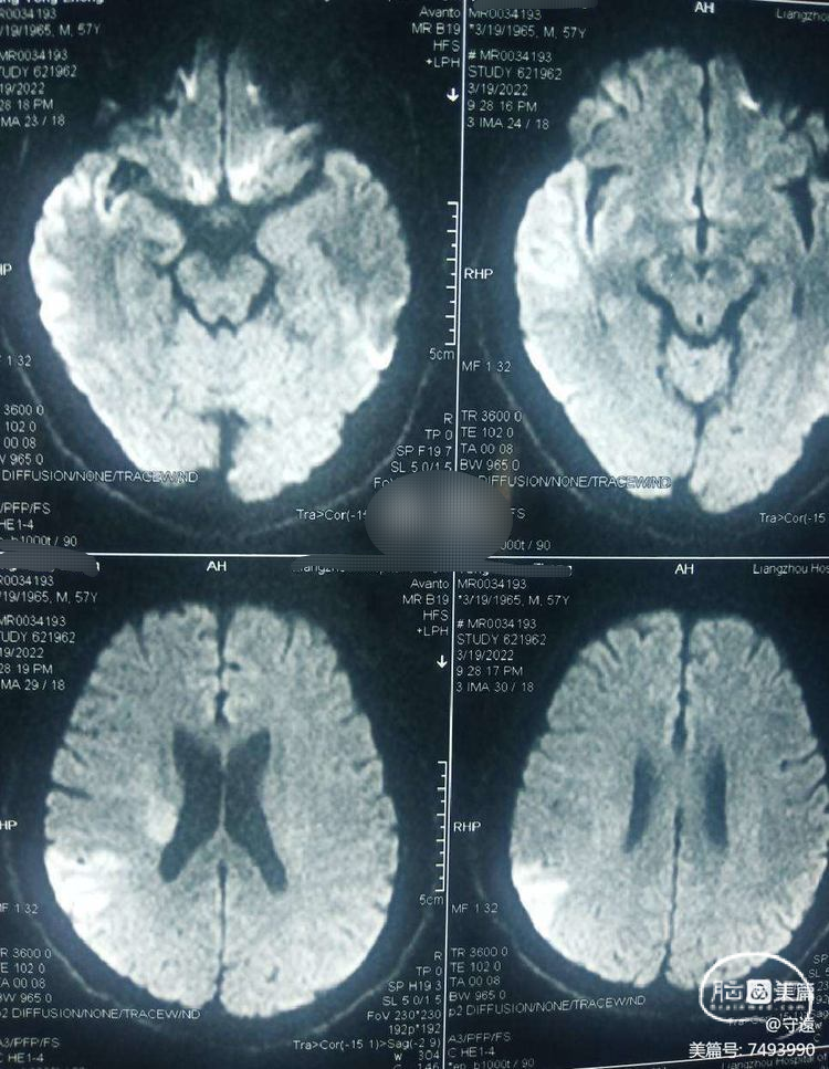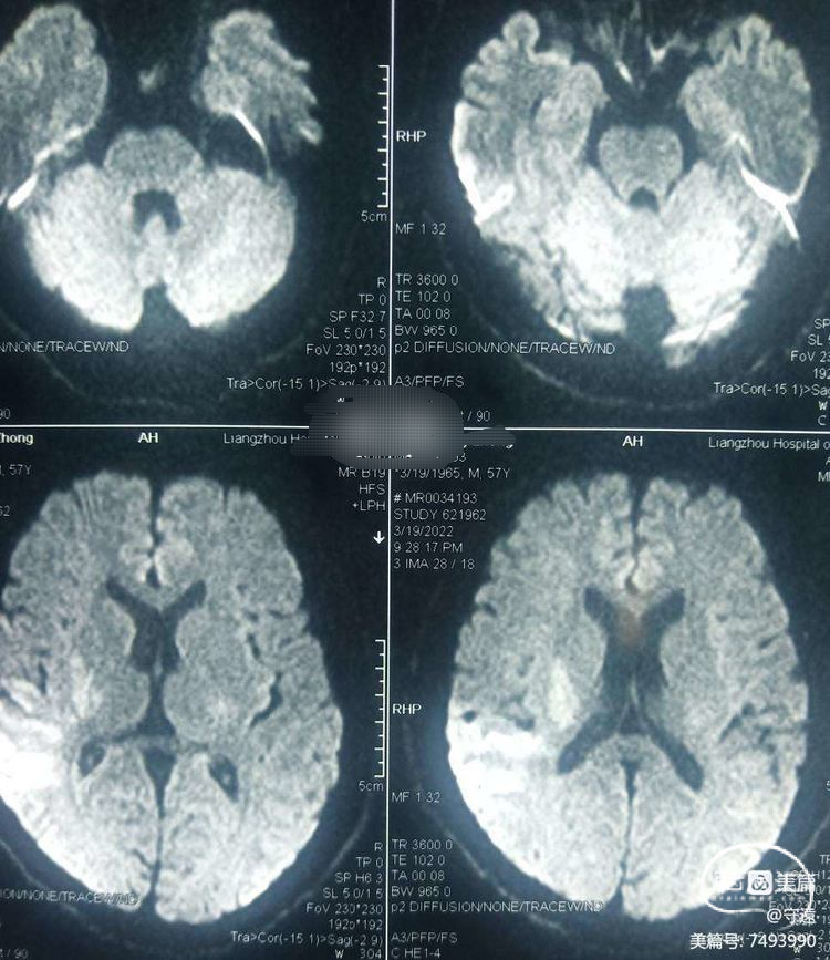 CT无出血,核磁共振:DWⅠ显示右侧颞枕顶大片状高密度。考虑为大血管闭塞(心源性血栓可能)。