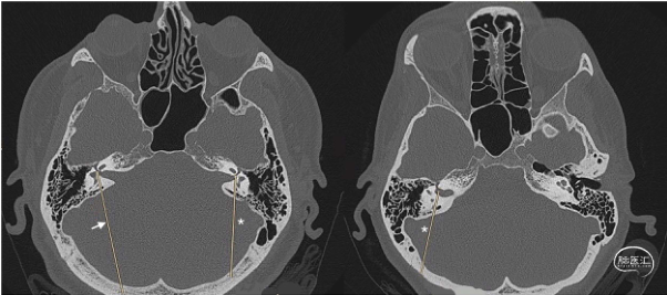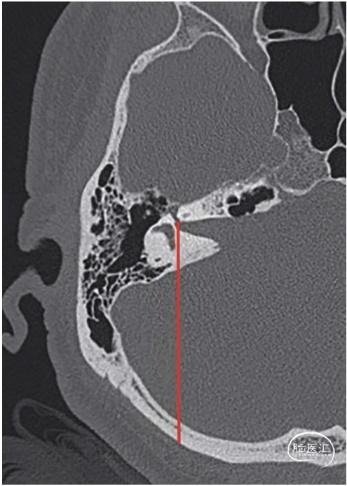 图1. CT轴位骨窗像。FLL线(红色)从面神经管开口开始,向后方走行和后半规管的轴线相切。