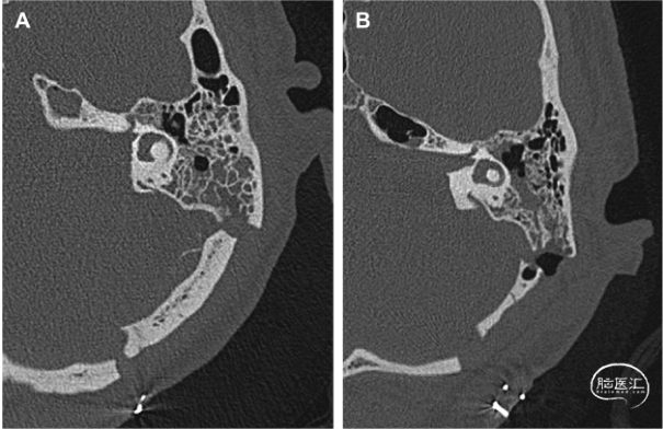 图3. CT轴位成像显露内听道底暴露的程度。A. 完全显露:磨除内听道后壁和顶壁后开颅至面神经管开口的手术路径;B. 未显露:内听道后上壁在内听道底的残余外侧部分。