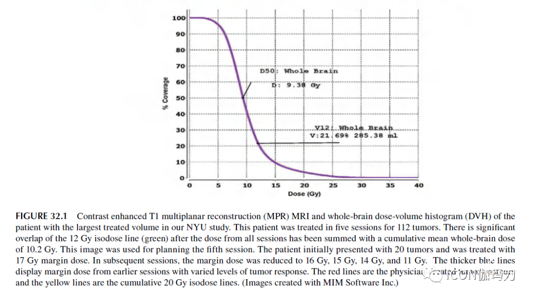 图32.1我们纽约大学(NYU)研究中治疗体积最大的患者的T1多平面重建(MPR) MRI和全脑剂量体积直方图(DVH)。该患者共接受了5次治疗,共治疗112个肿瘤。在将所有疗程的剂量与10.2Gy的累积平均全脑剂量相加后,12Gy等剂量线(绿色)有显著重叠。这个图像用于计划第五个疗程。患者最初出现20个肿瘤,并接受了17Gy边缘剂量的治疗。在随后的治疗中,边缘剂量降低到16Gy、15Gy、14Gy和11Gy。较粗的蓝线显示早期不同程度的肿瘤反应的边缘剂量。红线是医生绘制的肿瘤轮廓线,黄线是累积20 Gy等剂量线。