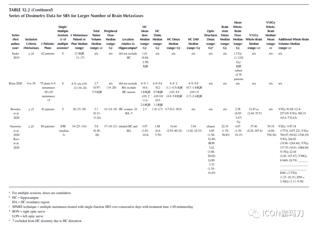 表32.2SRS治疗数目多的脑转移瘤的剂量学数据。