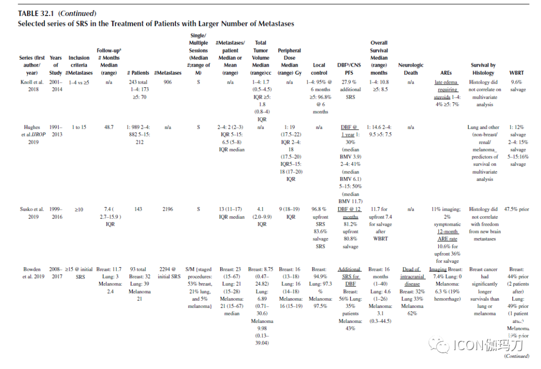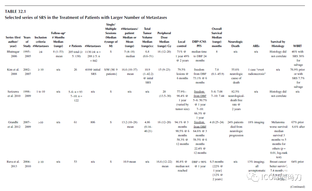 表32.1选择的SRS治疗数目较多的转移瘤患者的系列。