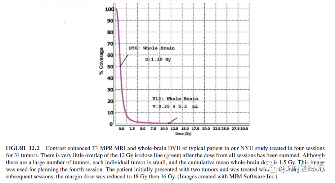 图32.2我们纽约大学(NYU)研究中典型患者的T1 MPR增强MRI和全脑DVH,4次疗程共治疗了31个肿瘤。在所有疗程的剂量相加后,12Gy等剂量线(绿色)的重叠很小。虽然肿瘤数目众多,但单个肿瘤体积较小,累积平均全脑剂量为1.5 Gy。该影像用于计划第四次疗程。患者最初出现两个肿瘤,接受20Gy边缘剂量的治疗。