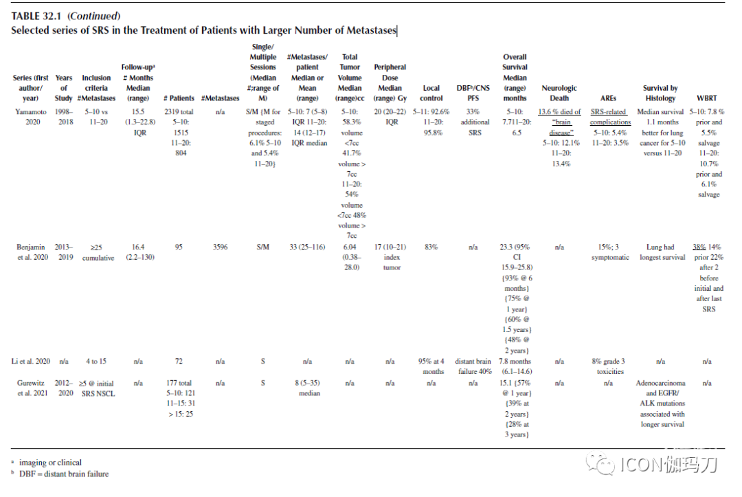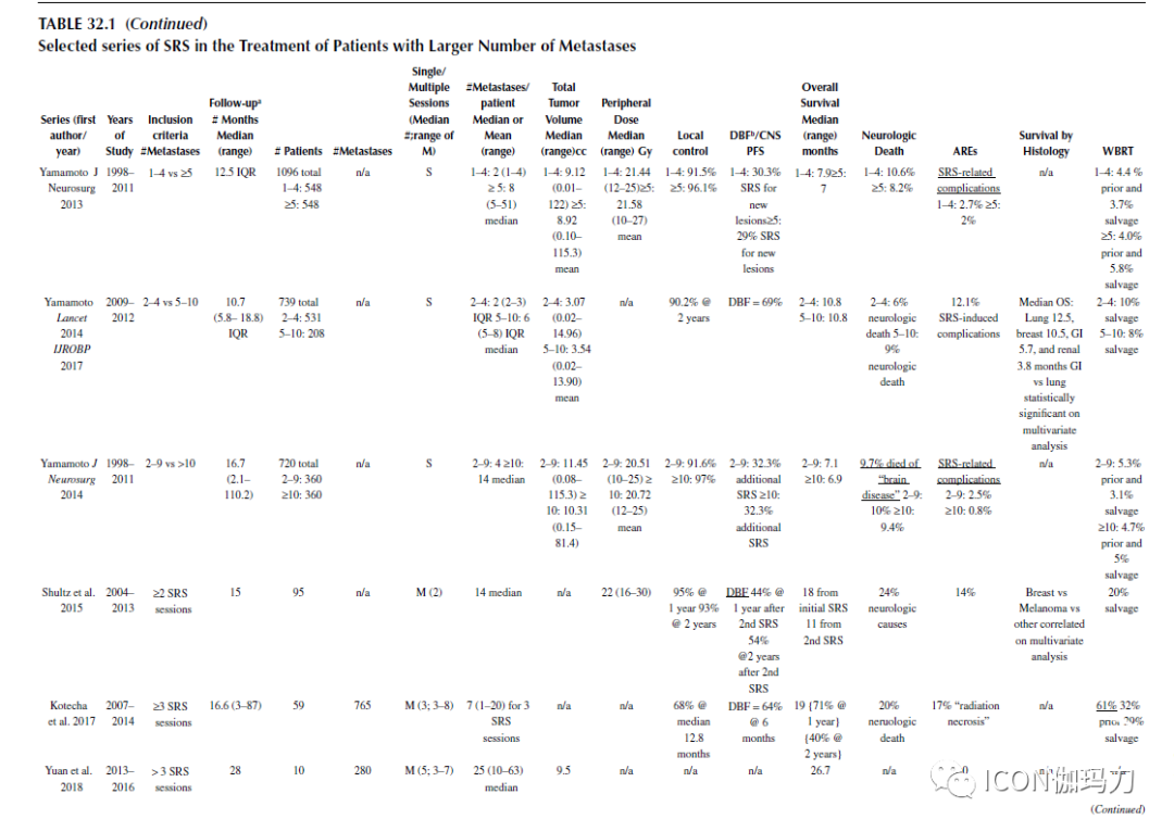 在20世纪90年代,Yamamoto等人提出了一个独特的经验,用伽玛刀SRS分别治疗了36个和37个肺癌脑转移瘤的患者。在SRS治疗后,患者有临床和影像学反应,生存时间分别为4.5和5.5个月。随后发表的针对4个以上转移瘤的机构经验表明,没有发现明显的毒性,经验表明使用SRS不会影响生存率(见表32.1)。匹兹堡大学的一项研究通过对中位5个转移瘤患者的脑转移瘤分级RTOG递归分区分析(RPA)进行评估,表明在选择SRS治疗的患者中,生存率比历史上使用WBRT缩获得的生存率更好。重要的是,影响生存率的不是转移瘤的数目,而是肿瘤的总体积。来自日本的一项大型病例匹配分析显示,虽然有5个或5个以上转移瘤的患者的总体生存期比有1-4个转移瘤的患者稍差(7个月vs . 7个月),但与SRS治疗相关毒性在两组中是相同的。