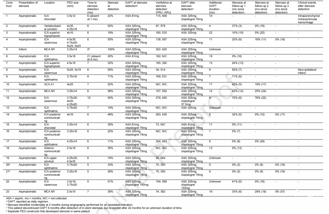 研究共筛选出23例PED支架内狭窄,且均使用DAPT进行治疗,其中19例可进行血管造影随访。17例(17/19,89%)PED支架内狭窄DAPT治疗后达到了主要终点,即没有狭窄进展和没有新的同侧缺血性事件。在未能达到本研究主要终点的2例PED中,一例显示支架内狭窄在16个月内从55%加重至76%,而另一例在检测到支架内狭窄4个月后发生同侧缺血性卒中。此外,还有1例患者在开始DAPT后9个月时发生颅内出血(表1)。