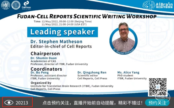 此前AiBrain邀请了Cell Reports主编亲自教大家论文写作技巧,本次讲座参与人次已高达20,000+!可点击图片、长按识别图中二维码,进入直播间观看精彩回放。