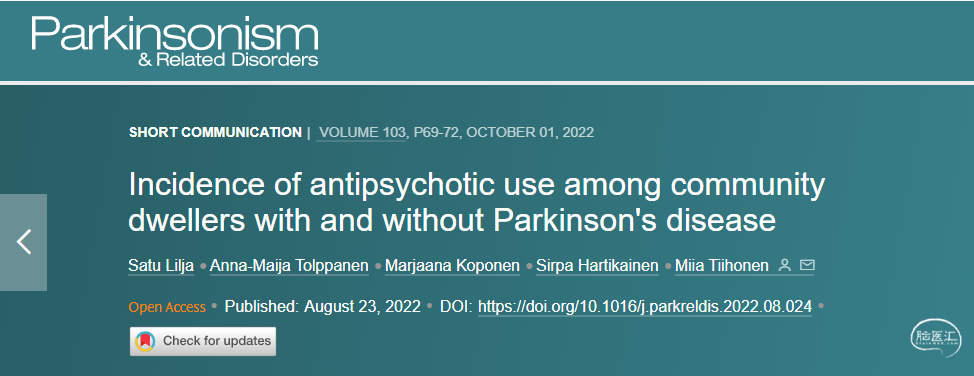 Reference:[Lilja S, Tolppanen AM, Koponen M, Hartikainen S, Tiihonen M. Incidence of antipsychotic use among community dwellers with and without Parkinson’s disease. Parkinsonism Relat Disord.2022 Aug 24;103:69-72.