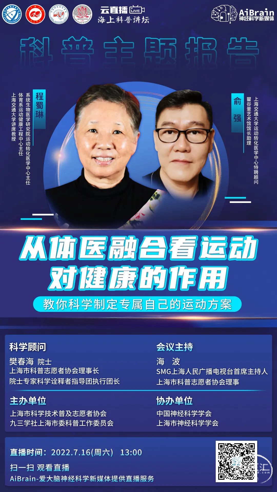 本期海上科普讲坛的主题为“从体医融合看运动对健康的作用:教你科学定制专属自己的运动方案”,主讲人为上海交通大学讲席教授程蜀琳教授、上海交通大学运动转化医学中心特聘顾问俞强。