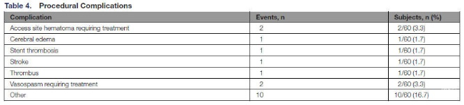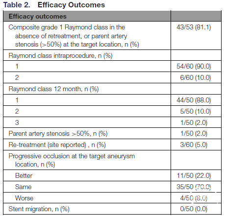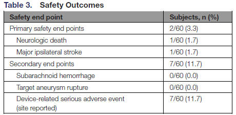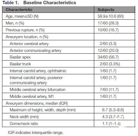 共确定了60个受试者。平均年龄为59岁,其中28.3%为男性。中位动脉瘤大小为6.7mm,中位颈部大小为4.3mm。常见的动脉瘤部位包括基底动脉尖(56.7%)、前交通动脉(20.0%)和大脑中动脉分叉(11.7%)。81.1%的受试者达到了主要疗效终点,1.7%的受试者经历了主要的同侧卒中或神经系统死亡的安全终点。
