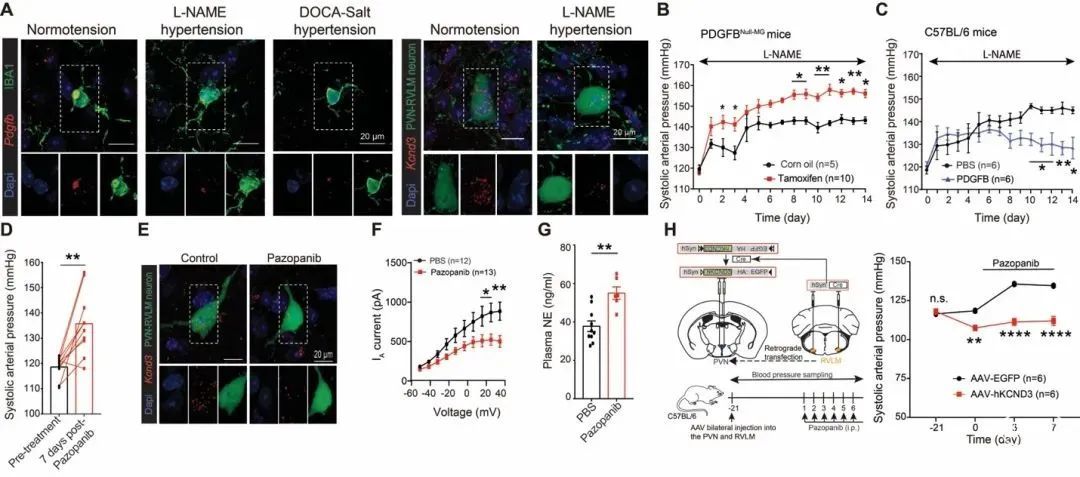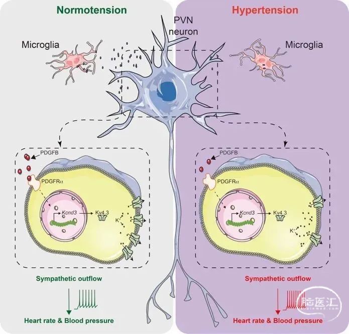研究者发现多种高血压小鼠模型中小胶质细胞的PDGFB表达以及PVN-RVLM神经元中的Kv4.3表达均显著下调。去除小胶质细胞中的Pdgfb或者外源性补给重组PDGFB蛋白均可以改变高血压的进程。提示这一通路的受损参与了交感高张和血压的升高。