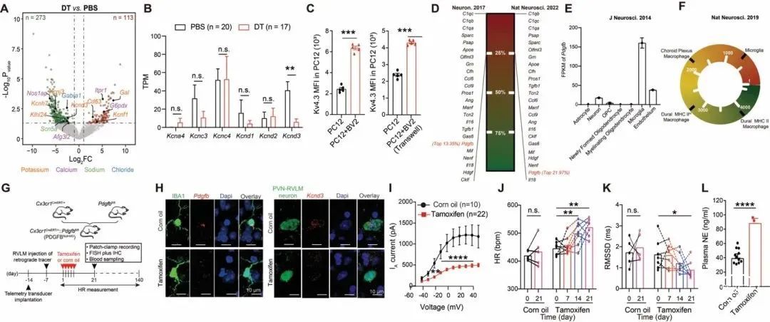 通过对PVN-RVLM神经元进行单细胞测序,发现小胶质细胞的缺失导致介导IA电流的钾离子通道编码a亚基的Kcnd3表达减少。共培养实验表明小胶质细胞是通过旁分泌的形式对神经元中该基因进行直接调控。