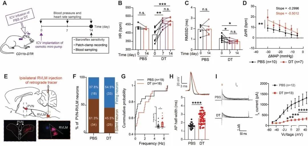 通过膜片钳对下丘脑室旁核中投射到脑干头端腹侧延髓(RVLM)的前交感神经元(简称PVN-RVLM)进行电生理分析,发现去除了静息态的小胶质细胞极大的抑制了一过性外向钾电流(IA),导致PVN-RVLM神经元的电活性增加和交感输出增多。