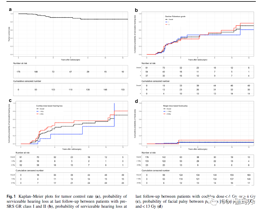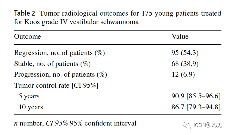 本回顾性、多中心分析纳入SRS治疗的年龄≤45岁,因Koos IV级VS 出现非威胁生命的或使人丧失行为能力症状(presenting with non-life threatening or incapacitating symptoms )的患者,随访≥12个月。评估肿瘤控制和神经结局。