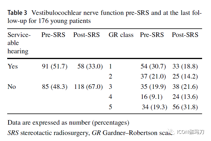在SRS中有有效听力(即GR1和2级)的占51.7%,在最后一次随访中占33.0%。随访3年、5年、10年精算有效听力保留率分别为70.4%、56.8%、45.2%。据报道,SRS治疗大的VS 患者后的有效听力保留率在0 - 82%之间,这与最近发表的年轻的队列相似。SRS治疗前(Pre-SRS )GR 分级 I级,中枢耳蜗受照剂量<4.2 Gy,平均耳蜗受照剂量<6 Gy,年龄<60岁为与听力保留的相关因素。在我们的研究中,在多变量分析中,女性性别是最后随访中与有效听力相关的唯一因素。