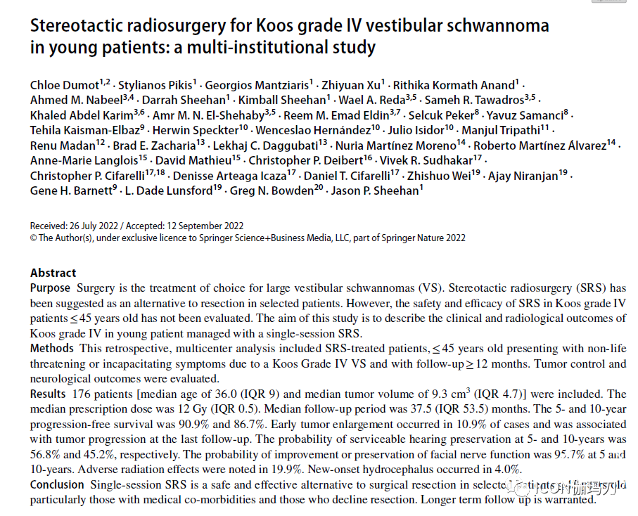 《Journal of Neurooncology》杂志2022年9月27日在线发表美国、法国、埃及、土耳其、多米尼加、印度、西班牙、加拿大的Chloe Dumot, Stylianos Pikis , Georgios Mantziaris,等21位专家联合撰写的《立体定向放射外科治疗年轻Koos IV级前庭神经鞘瘤患者:多中心研究Stereotactic radiosurgery for Koos grade IV vestibular schwannoma in young patients: a multi-institutional study》(doi: 10.1007/s11060-022-04134-0. )。