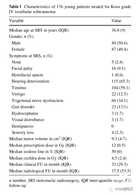 本研究纳入≦45岁的患者,来自国际放射外科研究基金会的10个参与中心采用单次SRS治疗IV级VS 患者。每个研究中心都获得伦理审查委员会对研究和共享数据库的批准。纳入标准为(1)单次SRS治疗的Koos IV级VS ,(2)至少有12个月的临床和影像学随访,(3)治疗时年龄≦45岁。