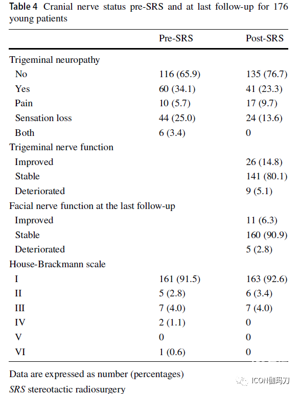 在最近的研究中,SRS治疗大型前庭神经鞘瘤后的面神经病变发生率为0 - 4%。在本研究中,在最后随访的患者中,有2.8%的患者面神经功能恶化。SRS治疗后3、5、10年面神经功能改善或保留率分别为98.7%、95.7%和95.7%。