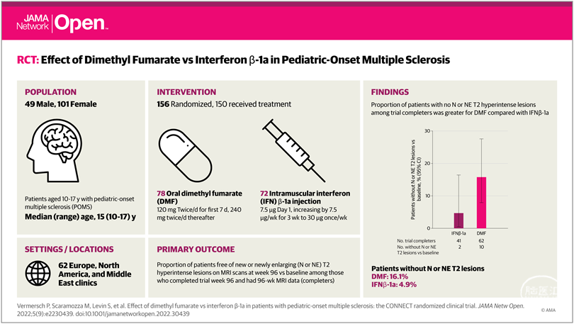 为探究富马酸二甲酯(DMF)治疗小儿多发性硬化症的有效性,伦敦Patrick Vermersch等研究学者对150名受试者展开随机对照试验,比较了富马酸二甲酯与肌内注射干扰素β-1a(IFNβ-1a)在小儿多发性硬化症中的疗效、安全性和耐受性,结果发布于2022年9月28《JAMA Netw Open》。