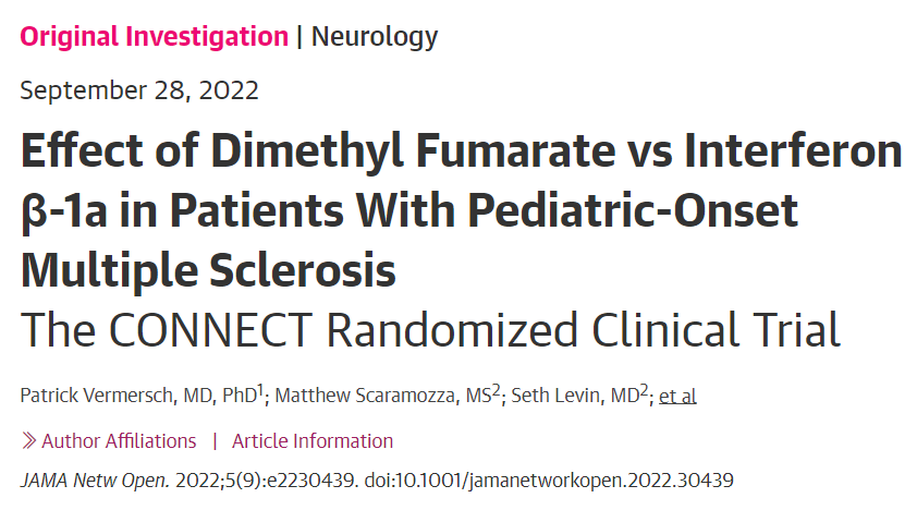 Reference:[Vermersch P, Scaramozza M, Levin S, et al. Effect of Dimethyl Fumarate vs Interferon β-1a in Patients With Pediatric-Onset Multiple Sclerosis: The CONNECT Randomized Clinical Trial. JAMA Netw Open. 2022;5(9):e2230439. doi:10.1001/jamanetworkopen.2022.30439]