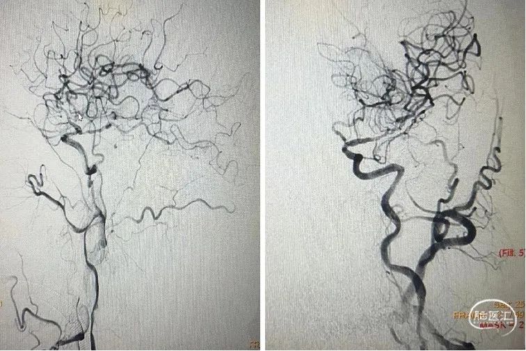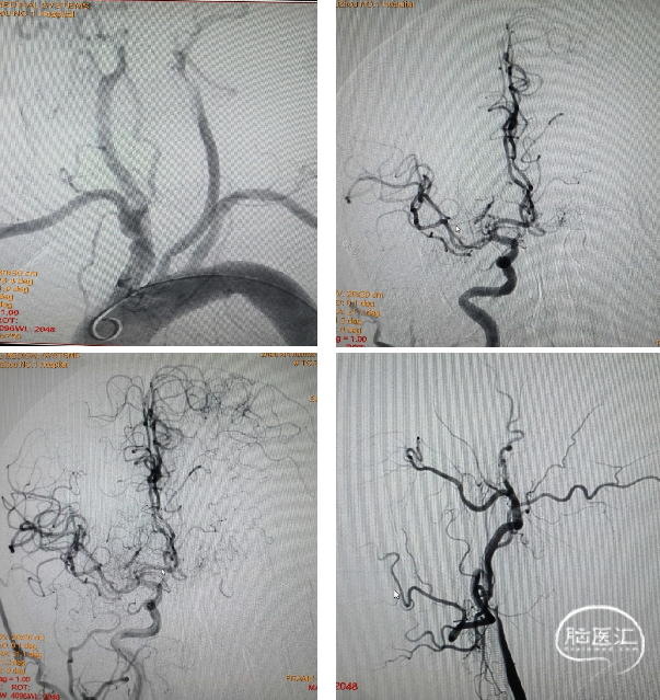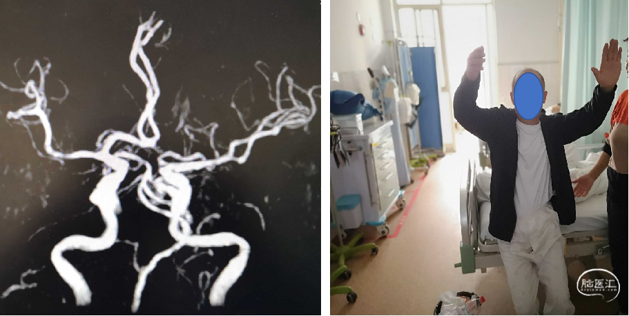 术后5天复查颅脑MRA:左侧颈内动脉远端及大脑中动脉血流通畅。患者右侧肢体近端肌力5-,远端4,NIHSS评分1分。