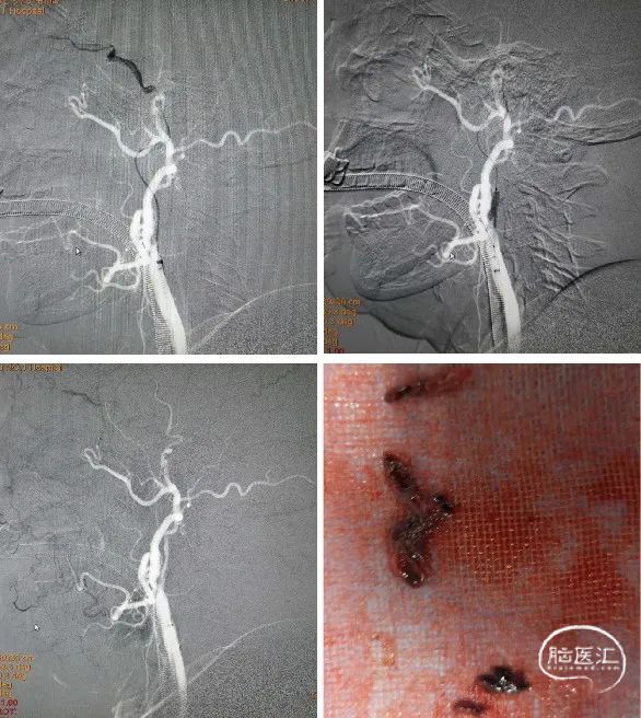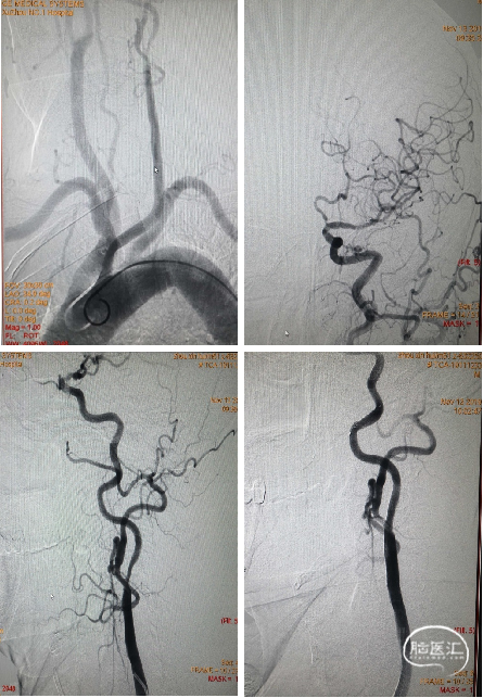替罗非班经静脉7ml/h维持,10min后经导引导管于颈总动脉造影显示:颈内动脉起始部重度狭窄,远段血通畅,(mTICI评分3级)。为降低风险,决定二期处理颈内动脉狭窄。