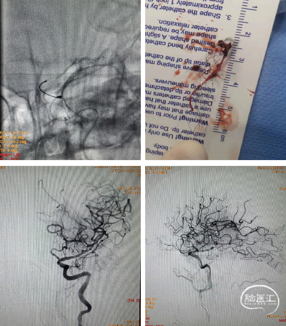 将Reco 4*20mm取栓支架送入血栓处,支架释放5min后,中间导管连接50ml注射器负压抽吸,撤出支架,成功拉出血栓。再次造影显示大脑中动脉M1段开通,但血管壁毛糙明显,经中间导管推注替罗非班7ml避免内膜损伤急性血栓形成。