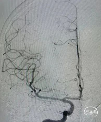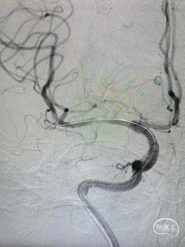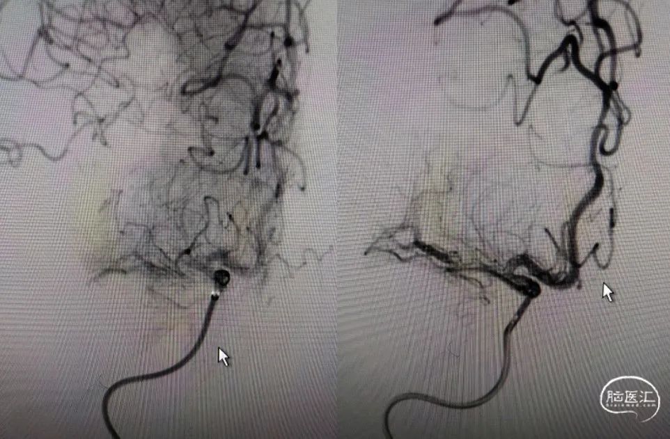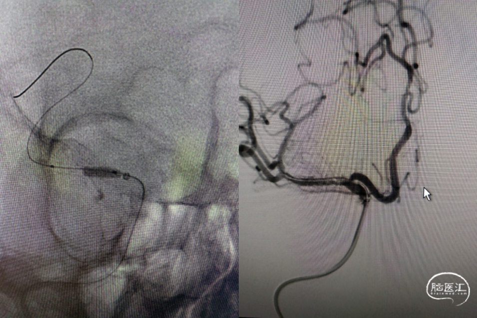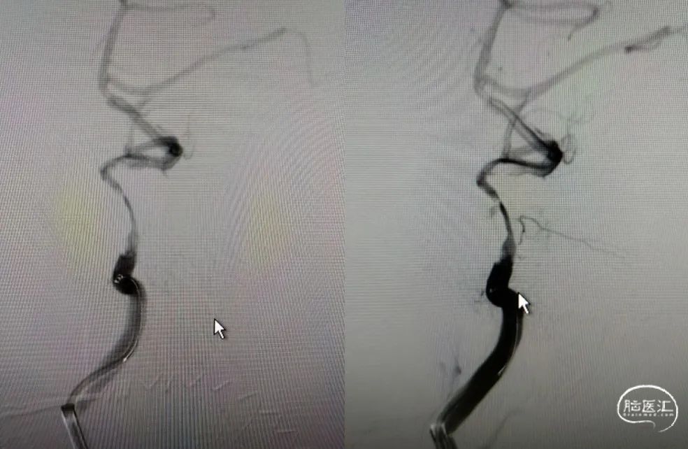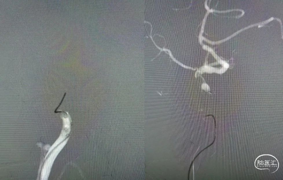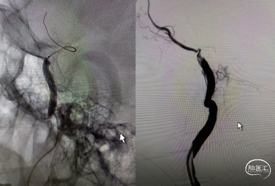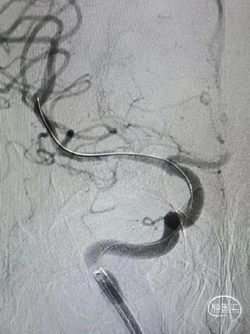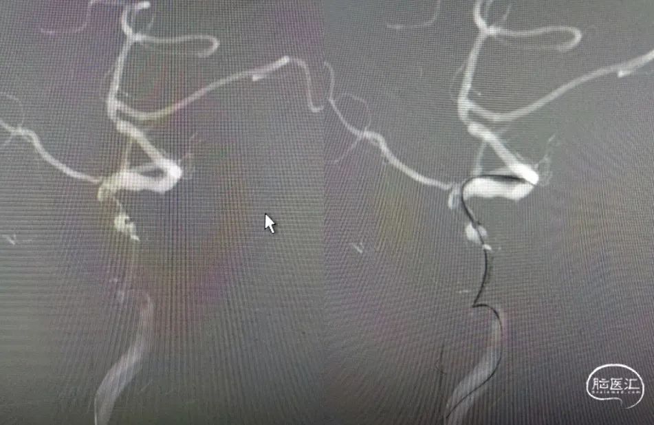 利用PTA球囊导管对狭窄处进行扩张,可见狭窄明显改善,但眼动脉段以后闭塞,再次将取栓支架予以取栓,可见斑块逃逸至M1段。