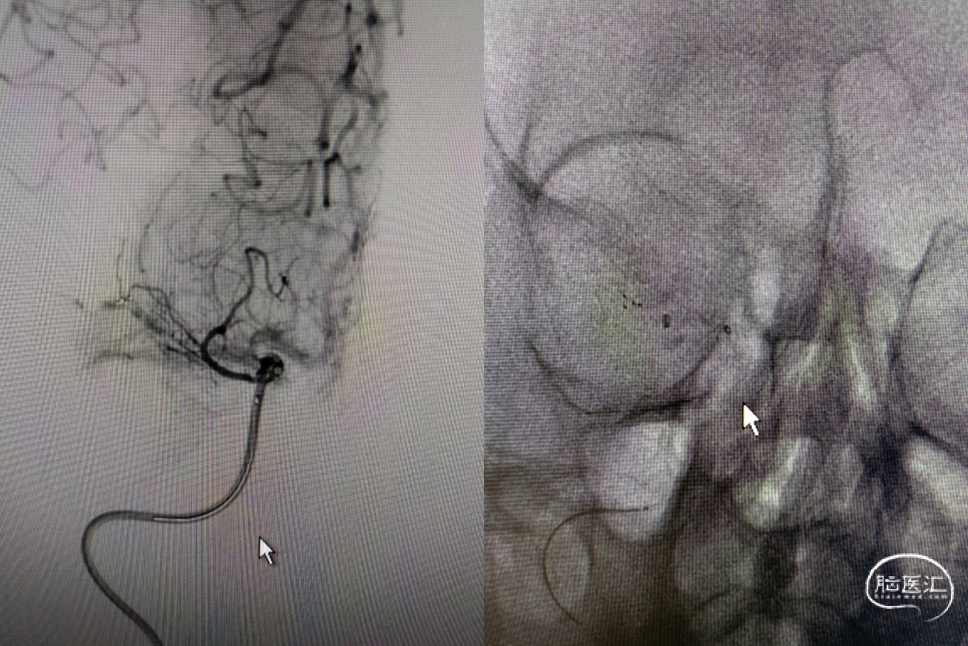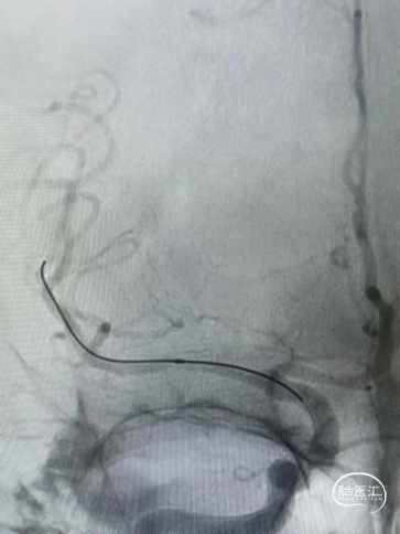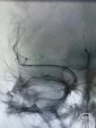 6F-远端通路导管在黑泥鳅导丝的指引下通过闭塞段送至眼动脉段,造影证实闭塞段在海绵窦段,予以ADPAT技术取出少量血栓,仍未开通。