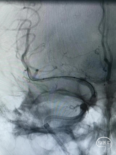 通过微导管释放取栓支架,SWIM取栓技术,可见海绵窦段狭窄,前向血流不稳定。